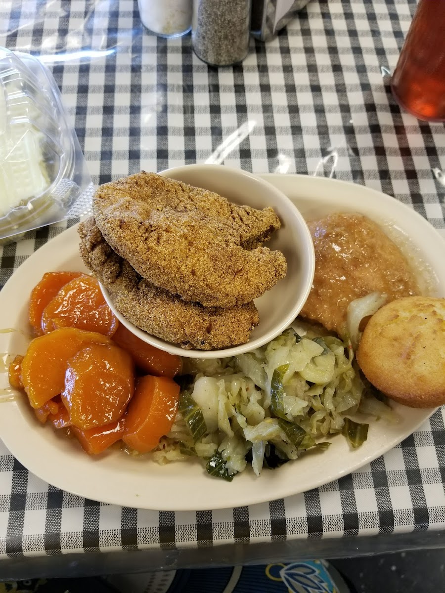Get there early. Once they're out, you're either waiting for a new batch or it's done for the day. If you're game for fresh, hot, southern cookin', then this is the place for you! 10/10 recommend. I enjoyed crisp fried catfish, yams, greenbeans, mac n' cheese & corn muffin. Washed down with a bottled coke.